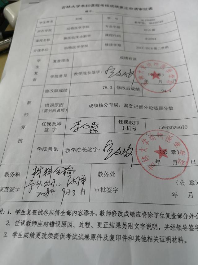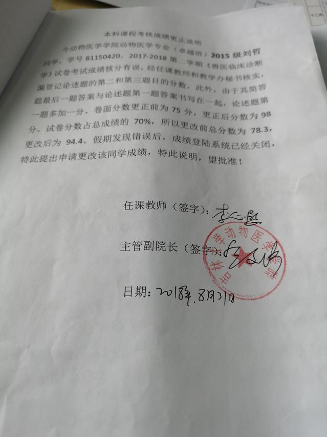 根据《关于进一步明确本科生课程考核等有关问题的通知》(校教字〔2018〕47号)文件有关精神,现对DB旗舰2015年级动物医学专业刘哲同学(学号:86150318)2017-2018-2学期兽医临床诊断学课程成绩更正如下: