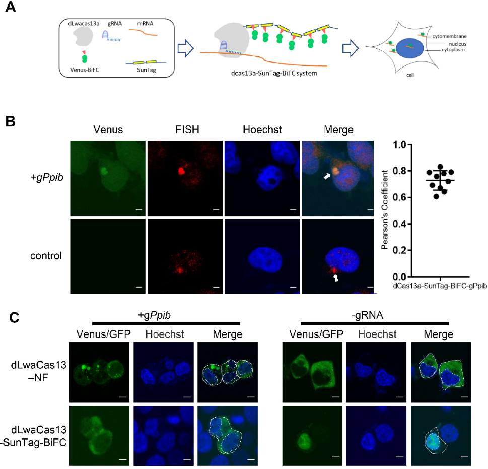 本研究基于Cas13蛋白靶向结合RNA原理,利用dLwaCas13a蛋白作为靶向目标RNA的追踪器。dLwaCas13a融合24×Sun Tag多肽负责招募大量荧光蛋白Venus。被招募的Venus荧光蛋白应用互补荧光蛋白技术分裂为两部分,当两部分结合重新激发荧光,可减少游离荧光蛋白背景。我们设计这一全新的RNA指示系统,为活细胞RNA成像提供更高分辨率和更低背景的新工具。