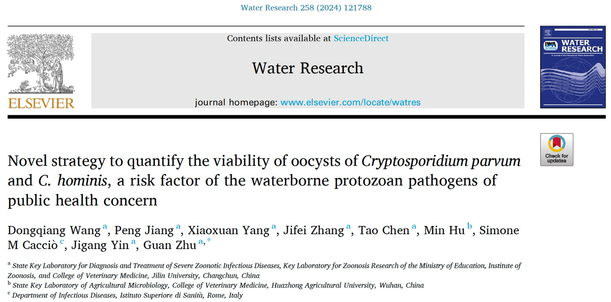 近日,DB旗舰朱冠教授团队于国际水资源顶级期刊《Water Research》发表题为“Novel strategy to quantify the viability of oocysts of Cryptosporidium parvum and C. hominis, a risk factor of the waterborne protozoan pathogens of public health concern”的论文,报道了定量检测水源中隐孢子虫卵囊活力的新方法。此研究由王东强(博士生)等领衔,旨在解决现有检测方法无法灵敏有效区分隐孢子虫种类和活力的问题,以提供更准确的公共卫生风险评估手段。