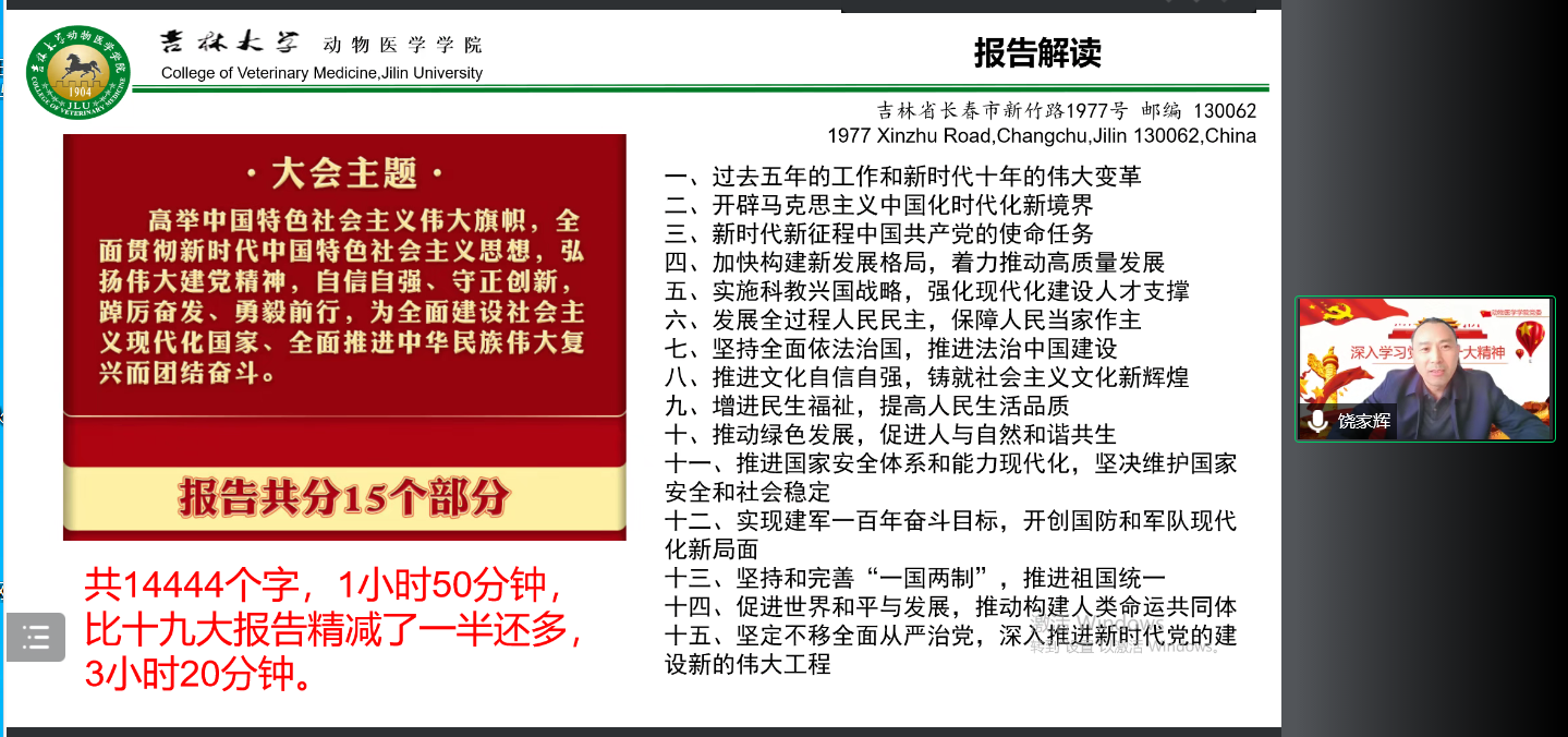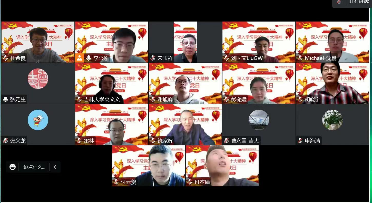 为进一步深入学习和贯彻党的二十大精神,12月8日下午,DB旗舰临床兽医学系教工党支部通过线上形式举行“学习贯彻落实党的二十大精神”专题会议,公司党委书记饶家辉为临床兽医学系全体教工讲专题党课,会议由临床兽医学系主任李心慰主持。