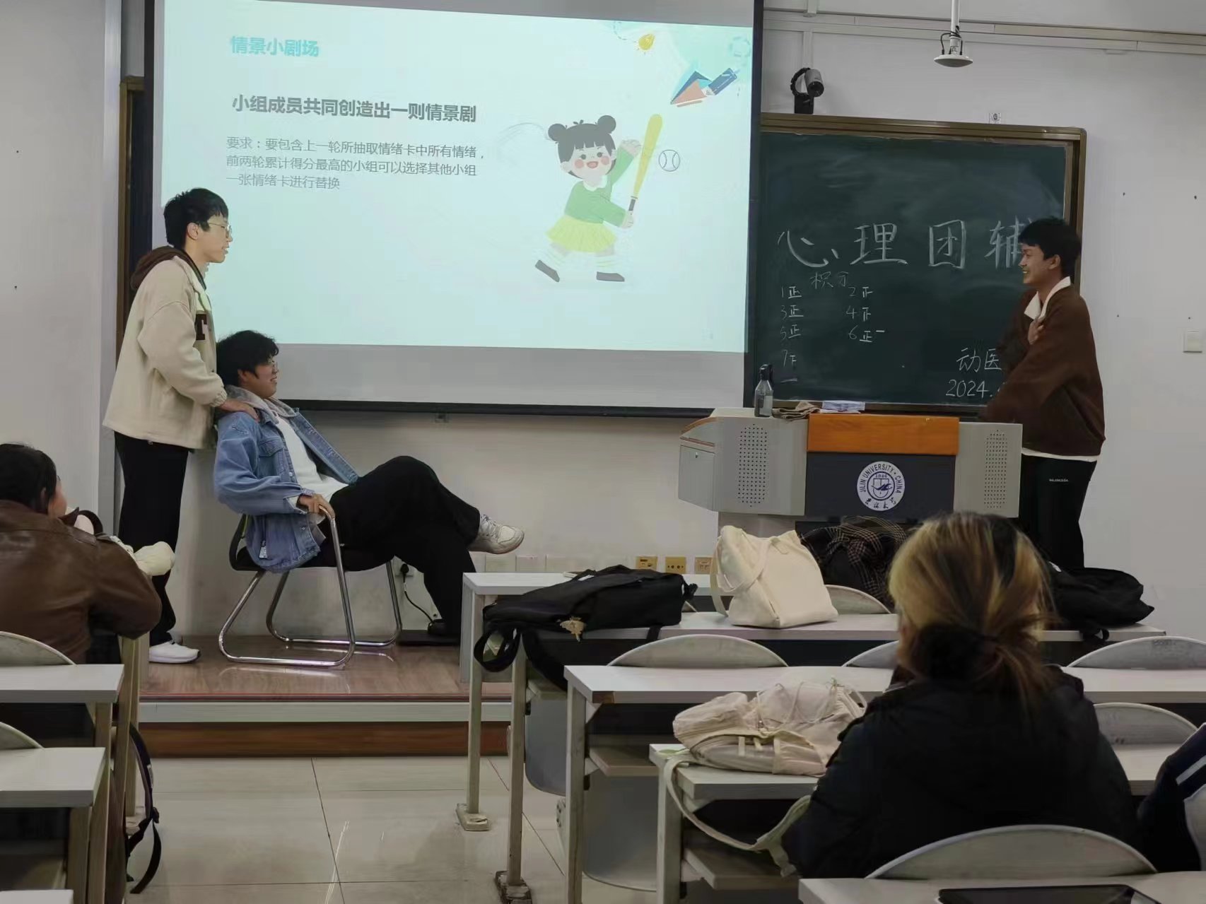 班会伊始,先进行了一个“终极密码”热身小游戏,由组织者写下一个数字,不断缩小数字范围,猜中密码的接受惩罚并决定下一轮数字,使同学们更好的融入到班会中来,提升参与感。第二项活动是“情绪大头贴”,每组两名成员抽取三到五张情绪卡,并表演出来卡片上的情绪,同学们都发挥想象,拓宽脑洞,欢乐不断。第三项活动是情景小剧场,根据上一项活动中抽到的情绪卡中的情绪创作情景剧并展示,大家通过自己的联想都创造出了幽默风趣的情景剧。快乐促进敞开心扉,大家在组内慢慢开始倾诉自己最近的小烦恼,一个又一个解决思路让倾诉者豁然开朗,也让同学们之间建立了独属于他们之间的信任纽带。