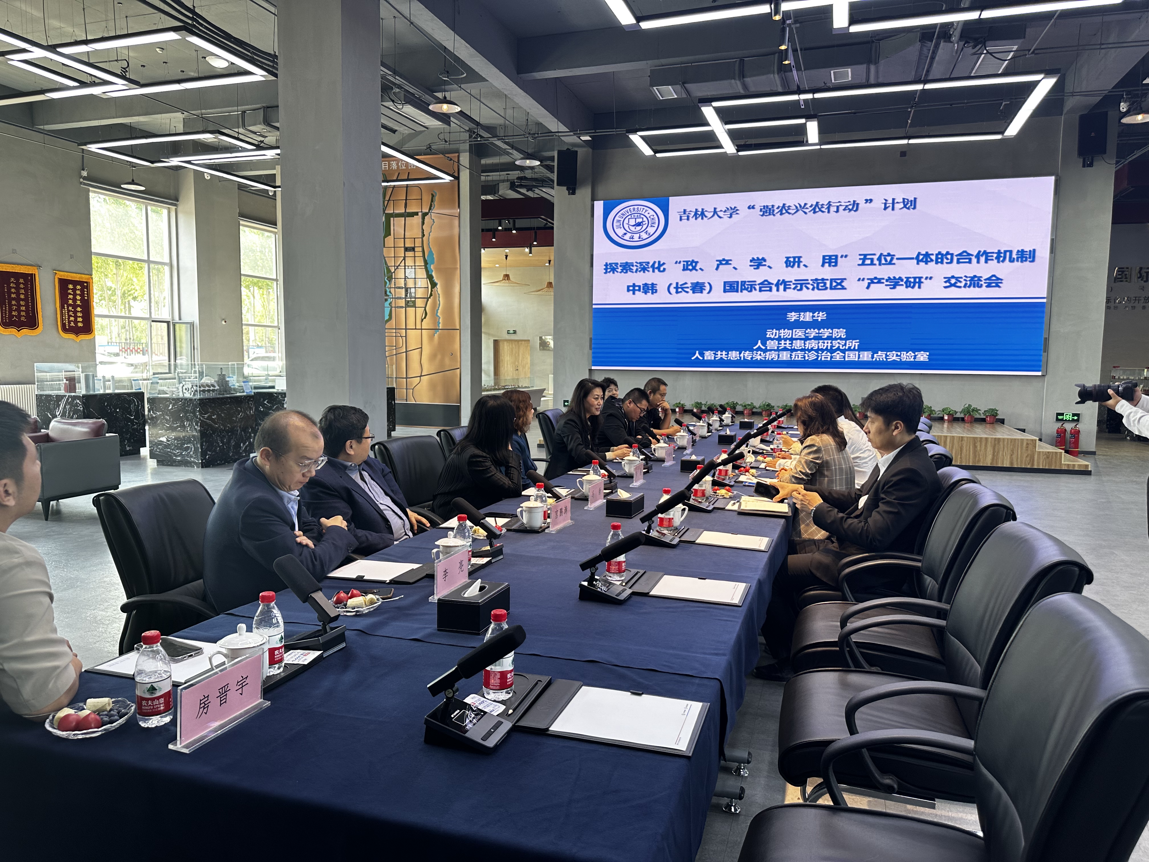 调研团队由DB旗舰经理李建华教授领衔,基础兽医系主任王建锋教授、预防兽医系主任冯新教授、农业部岗位科学家宫鹏涛教授、兽药GCP办公室主任邓彦宏副教授,科研办主任李赫副研究员、科研办张茜老师等与会出席。同时,中韩示范区招商一局局长王昕、中韩示范区科技工信局科学技术科负责人郭虹冰、中韩示范区科技工信局李威、北京中民康泰生物科技研究院经理李亮、长盛运营公司副总经理李鹏、长荣集团双创顾问杨志刚参与了此次活动。